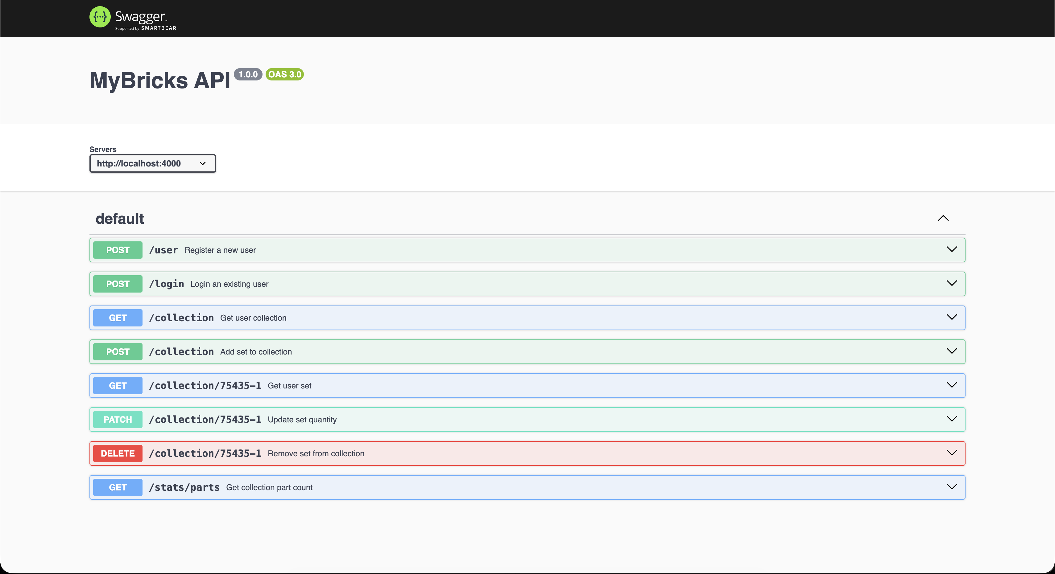 MyBricks is a backend web application built for LEGO enthusiasts to create accounts and organize their personal collections. The platform integrates with an external Rebrickable API to retrieve set information and implements a RESTful backend with user authentication, allowing users to securely manage their accounts, search for sets, and track their collections.